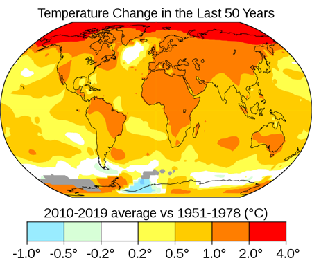 이 그림은 대륙별로 1951년부터 1978년 사이의 평균 기온에 견주어 2010년부터 2019년의 평균 기온이 얼마나 차이가 나는지 보여줍니다. 그림을 보시면 대부분의 지역이 노란색이나 적색으로 칠해져 있는 것을 확인할 수 있습니다. 범주를 보면 0.2℃ 이상의 온난화가 이뤄진 지역을 진한 색으로 표시했기 때문에 지구 대부분의 지역이 온난화를 겪고 있다고 볼 수 있습니다. 특히 태평양, 대서양, 인도양 같은 바다보다는 육지의 온난화 경향이 뚜렷하고, 남반구보다는 북반구가, 그리고 열대지역보다는 중·고위도 지역에서 온난화 경향이 강합니다. 그중에서도 북극 지역의 온난화가 가장 심한데, 다큐멘터리 <북극의 눈물>이나 언론을 통해서 많이 접하셨으리라 생각합니다.