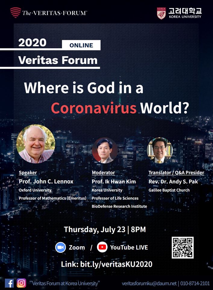 1992년 하버드대에서 시작된 베리타스 포럼은 세계 각국으로 퍼져 나가다가 국내에는 고려대가 중심대학이 되어 2018년 1회를 시작하였고, 올해 3회째가 되었습니다. 1회에서는 오스 기니스 교수를 주강사로 모시고, 강영안 교수, 우종학 교수가 과학자와 철학자의 기독교적 사유라는 주제로 대담을 했고, 2회에서는 제임스 스미스 교수를 주 강사로 "우리는 무엇을 사랑하는가"라는 주제를 다루었습니다. 올해는 영국 옥스퍼드대 수학과 명예교수이신 존 레녹스(John Lennox) 교수를 모시고 “코로나바이러스 세상, 하나님은 어디 계실까?”라는 시의적절한 주제를 다루게 되었습니다.