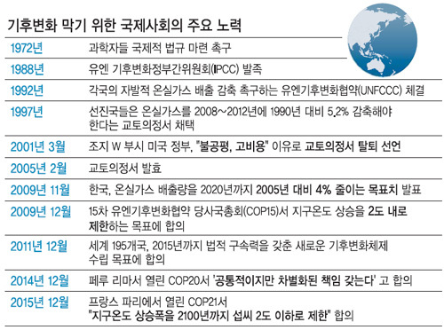 물론 모두 손을 놓고 있는 것은 아닙니다. 유엔기후변화협약은 1994년 3월 21일 발효되었고 거의 모든 국가(197개국)가 당사국으로 참여하고 있습니다. 기후변화협약의 목표는 ‘인간이 기후체계에 위험한 영향을 미치지 않을 수준으로 대기 중의 온실가스 농도를 안정화’하는 데 있습니다. 1997년 일본 교토에서 개최된 제3차 유엔기후변화협약 당사국 총회에서 구체적인 감축 의무를 담은 ‘교토의정서’가 채택되어 2005년 2월 16일 발효되었으며, 우리나라는 2002년 11월 8일에 의정서를 비준한 바 있습니다. 교토의정서는 미국, 일본, EU 등 선진국에 대해 제1차 의무 이행 기간(2008-2012년) 동안 구체적인 감축 의무(1990년 대비 평균 5.2%)를 규정했습니다.