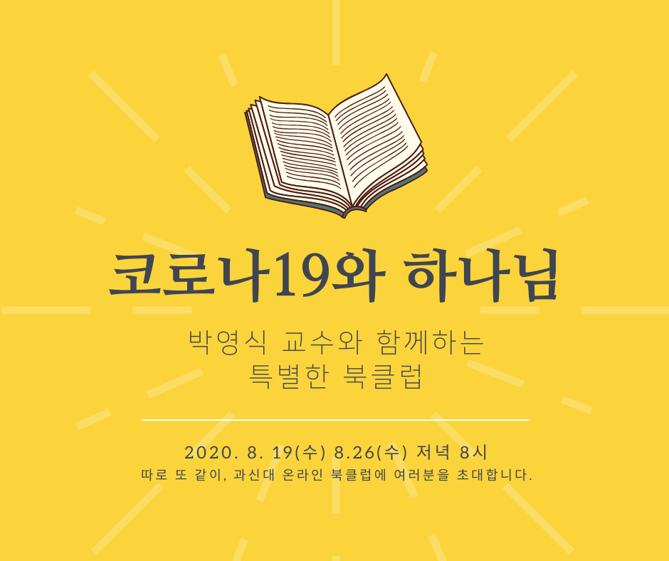 지난 8월 19일과 26일, 2주간 과신대 온라인 북클럽이 진행되었습니다. 북클럽에서 다루었던 책은 『하나님과 팬데믹』 (톰 라이트 지음, 비아토르, 2020)과 『다시 춤추기 시작할 때까지』 (월터 브루그만 지음, IVP, 2020)라는 책이었습니다. 북클럽에서 대담을 나누어주신 분은 박영식 교수님(서울신학대학교 조직신학, 과신대 자문위원)이셨습니다. 각각의 북클럽은 총 2부로 구성되어 진행되었는데, 1부는 책에 대한 간략한 설명 및 정리를, 2부는 참여자들의 자유로운 토론과 질문, 논의가 이루어졌습니다. 본 지면에서는 1부에서 다루어진 책의 내용을 중심으로 언급된 이야기들을 소개하고자 합니다.