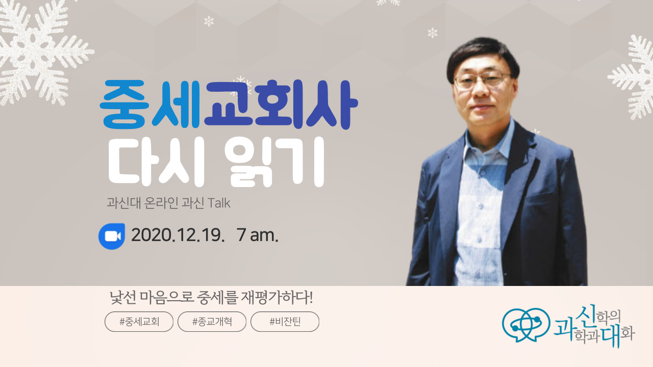 이 글은 분당/판교 북클럽에서 주관한 <온라인 과신톡>의 강연, 최종원 교수님의 "중세교회사 다시 읽기" 내용을 요약한 것입니다. 최종원 교수님의 강연과 그 후 질의응답을 통해 보완된 내용을 따로 구분하지 않고 같이 묶어서 정리했습니다. 본격적인 교회사 강연에 앞서 역사철학의 이해에 대한 심도 깊은 설명이 있었는데, 이는 교회사 이해와 관련하여 그동안 우리가 가지고 있던 역사에 대한 편향된 관념을 바로 잡는 데 큰 도움이 되었습니다. 보통 암흑기라 생각하는 중세사에 대하여 새로운 시각을 제시하였고, 따라서 우리 개신교 신앙의 출발인 종교개혁에 대하여도 다시 성찰하게 했습니다.