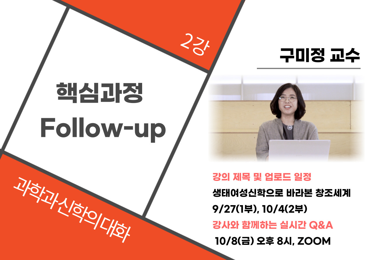 기후위기의 시대에 '지혜서'(송민원 교수)와 '여성신학'(구미정 교수)의 시각으로 하나님˙인간 ˙자연의 관계를 돌아보고, 창조세계를 바라보는 두 강의는 시기적절하고, 필요한 강의입니다. <핵심과정> 'Follow-up'과 함께 생태를 대하는 패러다임 전환을 경험해보시면 어떨까요?