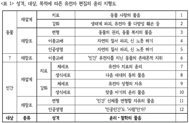 유전자 가위 기술은 이러한 과학기술 위험뿐 아니라 생명윤리 측면에서도 여러 논쟁을 낳고 있습니다. 저자는 대상, 종류, 성격이라는 세 가지 축으로 유전자 편집 관련 윤리 논쟁의 지형도를 제시하고 있습니다(표 1 참조). 대상은 인간 대상인가 동식물 대상인가에 따른 구분입니다. 그리고 현존하는 유전체를 변형시키는 재설계와 새로운 생명체를 만드는 재창조로 유전자 편집의 종류를 구분할 수 있습니다. 마지막으로 성격이라는 축은 유전자 편집의 목적입니다. 치료인지 강화인지에 따라 편집 성격이 구분될 수 있습니다. 이러한 대상, 종류, 성격이라는 축으로 저자는 유전자 편집 관련 윤리적 논쟁점들을 12개 범주로 구분하였고 각각의 범주별로 윤리 논쟁이 제기될 가능성과 다양한 윤리적 접근을 소개해 주고 있습니다. 동물 및 인간생식세포 관련 유전자 편집, 유전자 성형과 맞춤아기 관련 논쟁을 중점으로 설명하였습니다.
