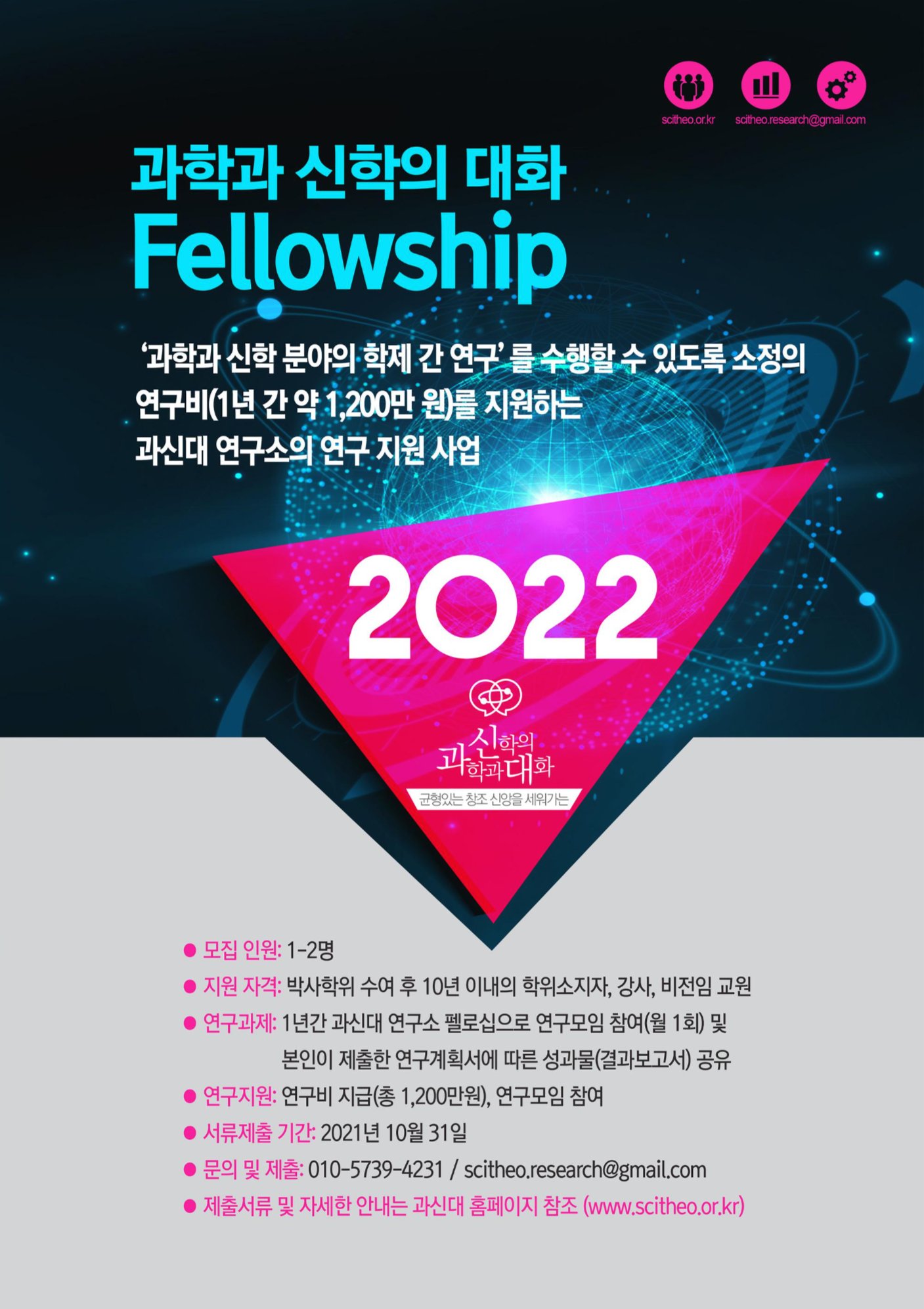 1. 내용: 박사 학위 소지자가 '과학과 신학 분야의 학제 간 연구'를 수행할 수 있도록 소정의 연구비(1년간 약 1200만 원)를 지원하는 과신대 연구소의 연구 지원 사업
