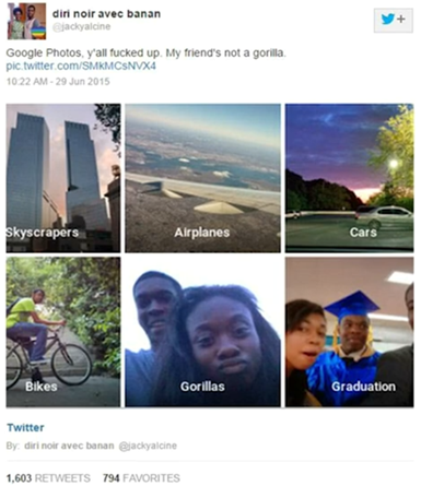 위 그림은 인종차별의 이슈를 보여줍니다. 2015년, 구글의 얼굴 인식 서비스가 한 흑인 남성의 여자 친구를 고릴라로 인식한 것입니다. 흑인 남성은 너무 화가 나서 자신의 SNS에 자신의 여자 친구는 고릴라가 아니라고 화를 내며 이의를 제기해 크게 화제가 되었습니다.