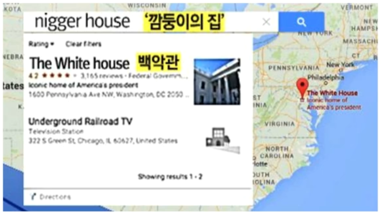 2015년 구글 지도에서 미국 워싱턴 DC를 연 다음 검색창에 nigger house라고 입력하면 백악관이 검색되었다고 합니다. 당시 미국 첫 흑인 대통령인 버락 오바마가 잘못 검색이 된 것입니다.