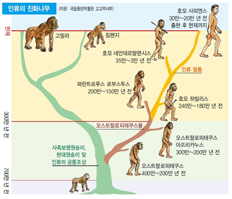 아래 그림은 우리가 인간의 진화에 관하여 책에서 가장 많이 본 그림일 것이다.