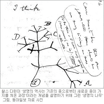 다윈은 나무가 가지 쳐서 분기하는 것처럼 생명은 진화한다고 했다. 생명의 역사는 새로운 종이 기존의 종으로부터 가지를 쳐온 과정인데, 오늘날 우리가 보는 생물들은 가지치기를 통해 말라 죽지 않고 살아남은 맨 끝 가지들이라는 것이다.