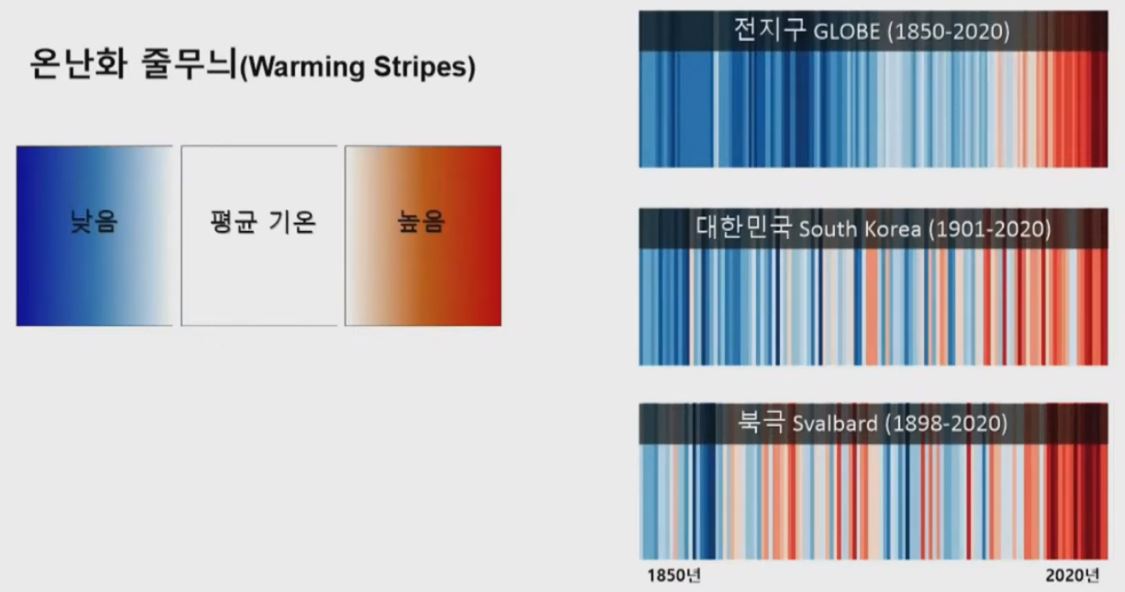위 그림은 온난화 줄무늬(Warming Stripes)입니다. 처음으로 대기의 온도를 측정했던 1850년부터 최근까지의 기록이 나타나 있습니다. 흰색인 평균 기온 보다 낮으면 파란색이고 높으면 빨간색입니다. 지역마다 조금씩 차이는 있지만 점점 빨간색이 많아지고 있습니다. 우리나라도 그렇지만 북극은 더 심합니다. 지구상에서 가장 빨리 기온이 높아지고 있는 곳이 바로 북극입니다.