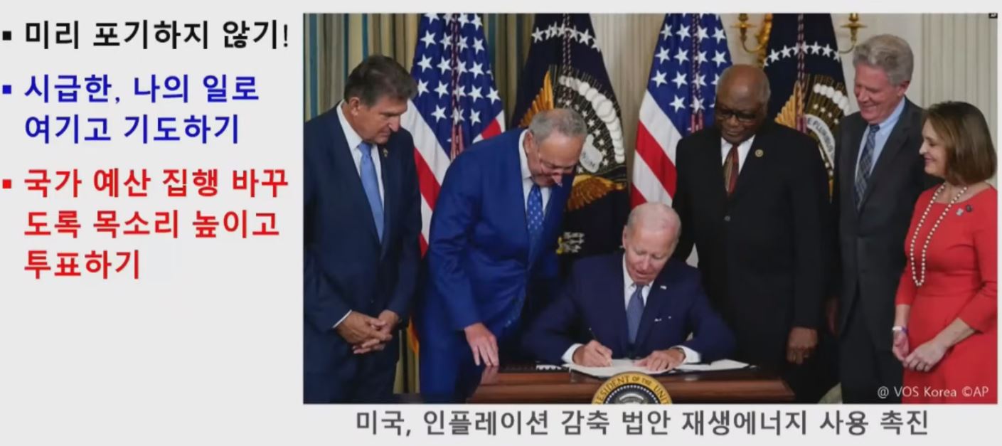 이러한 변화들에서 생각해 볼 수 있는 메시지는 다음과 같습니다. 우선, 기후 변화에 대해 미리 포기하지 말자는 것입니다. 그리고, 내 아이들과 관련된 아주 중요한 일이라고 여기고 기도 제목에 넣으면 좋겠습니다. 마지막으로 국가 예산에 반영될 수 있도록 목소리를 높이고 그런 정치를 할 수 있게 투표를 제대로 하자는 것입니다.