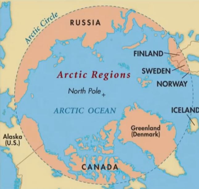 위 그림에 있는 원을 ‘아틱서클’이라고 하는데 우리말로는 ‘북극권’이라고 부릅니다. 러시아, 알래스카, 캐나다, 그리고 그린란드가 포함되어 있고 아이슬란드가 살짝 걸쳐있습니다. 핀란드, 스웨덴, 노르웨이까지 해서 북극권 8개국이라고 합니다.