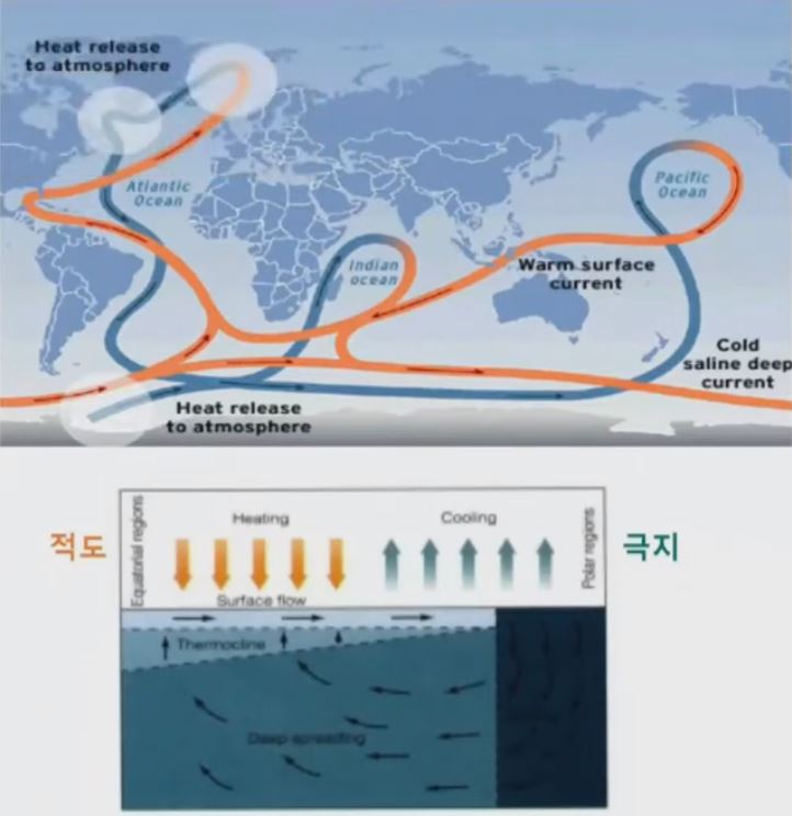 과학자들이 가장 걱정을 많이 하는 것은 해류입니다. 날씨를 결정하는 데 있어서 해류가 굉장히 큰 영향을 주기 때문입니다. 해류가 흘러가서 가라앉는 곳이 북극인데요, 가라앉는 이유는 수많은 강물이 흘러들어 간 북극이 염도가 낮고 해류는 높기 때문입니다. 해류의 순환입니다. 유럽은 따뜻한 해류가 올라가기 때문에 겨울에도 온화합니다. 그런데 최근에 그린란드에서 엄청나게 얼음이 많이 녹았습니다. 많이 녹은 얼음이 바다로 흘러 들어가면 어떤 일이 일어날 수 있을까요? 해류가 북극까지 가기 전에 그린란드에서 먼저 가라앉을 수게 됩니다. 영화 투모로우에서 봤던 그런 현상이 실제 나타날 수 있게 됩니다. 앞으로 어떤 일이 일어날지 알 수는 없지만, 북극이 많은 키를 갖고 있다는 것은 확실합니다.